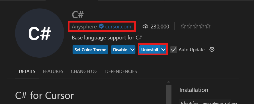 (Cursor의 개발사에서 `anysphere.csharp`라는 id로 C# Extension을 게시 해 두었다)