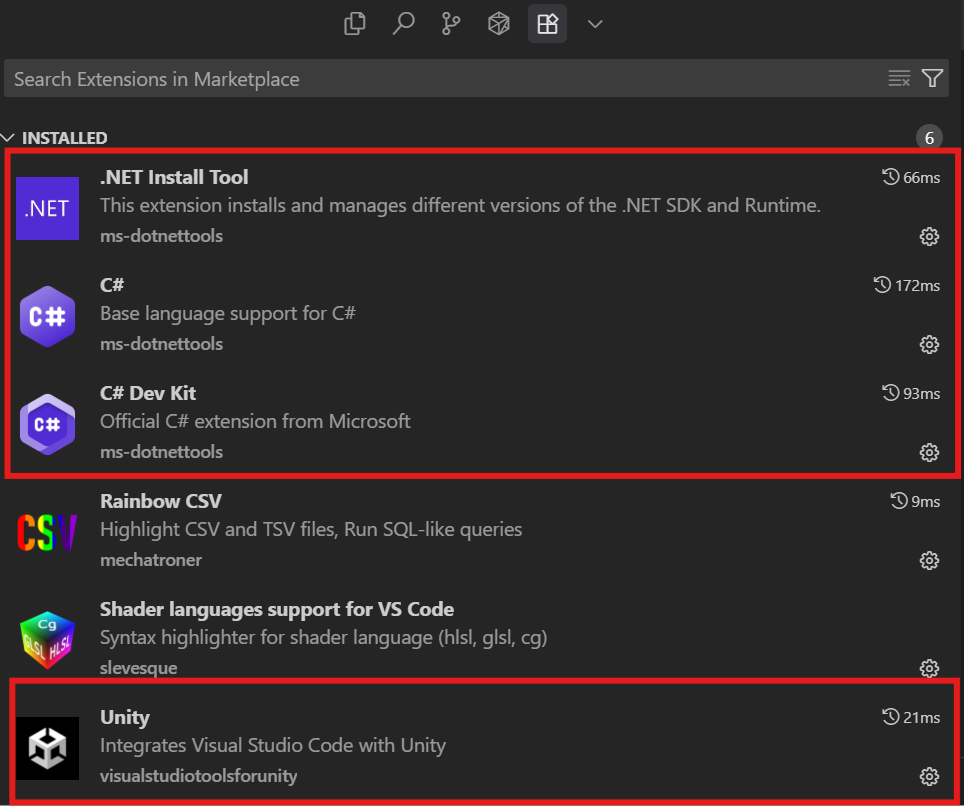▲ C#, C# Dev Kit, Unity가 설치된 모습